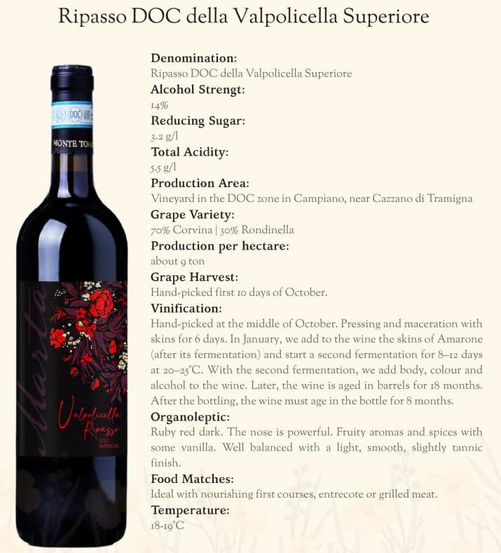 Efter høst i oktober presses og fermenteres druerne. I januar tilsættes ca. 30 procent af de tørrede druer, der har været anvendt til Amarone. Vinen har lagret 18 måneder på egetræsfade.